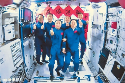 神舟十五號(hào)航天員乘組與神舟十六號(hào)航天員乘組拍下“全家?!薄?/p>