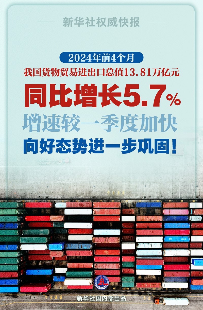 同比增長5.7%,前4個(gè)月我國外貿(mào)增速加快 海關(guān)總署5月9日發(fā)布數(shù)據(jù)今年前4個(gè)月我國貨物貿(mào)易進(jìn)出口......