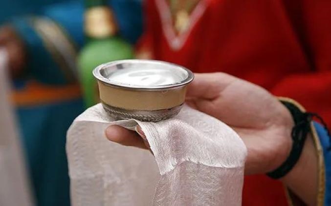 傳統(tǒng)鍋茶的制作方法是先用銅鍋將奶茶熬好,之后加入風(fēng)干肉、奶酪、奶皮子等,在鍋中邊煮邊吃。吃的時(shí)候?qū)⒛滩枋⒃谕胫?,加上奶豆腐和炒米,再和黃油混在一起。越往后,炒米和奶豆腐泡得越軟,味道口感越好。鍋茶咸咸的口味中含有濃濃的奶香,讓人回味無窮。