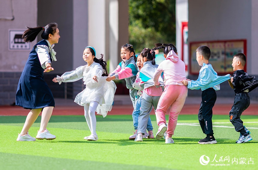 呼和浩特市玉泉區(qū)南柴火市街小學(xué)老師和一年級新生在操場上玩游戲。丁根厚攝