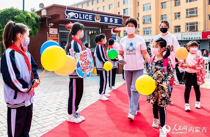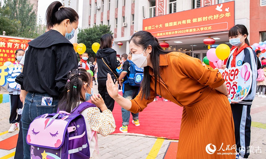 呼和浩特市玉泉區(qū)南柴火市街小學(xué)的師生們在歡迎一年級新生入校。丁根厚攝