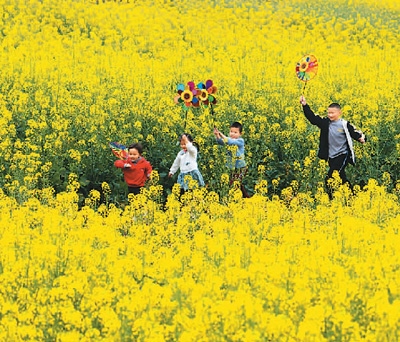 2022年,四川省眉山市仁壽縣謝安鎮(zhèn)扎林村對1200畝撂荒地集中整治,通過集體經(jīng)濟(jì)聯(lián)合社進(jìn)行統(tǒng)一種植、統(tǒng)一管理,既盤活了閑置土地、讓村民變股民,又讓荒山成景點。圖為3月5日,兒童在扎林村油菜花地里玩耍。 潘 帥攝(人民視覺)