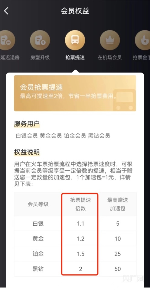 記者發(fā)現(xiàn),在另一個(gè)第三方購票平臺(tái),會(huì)員分為普通、白銀、黃金、鉑金、黑鉆等不同等級,不同等級享受不同權(quán)益。從搶票提速這一權(quán)益來看,普通會(huì)員并未享受搶票提速這一權(quán)益,而白銀到黑鉆會(huì)員的搶票速度則依次提高1.1倍、1.2倍、1.5倍、2倍。