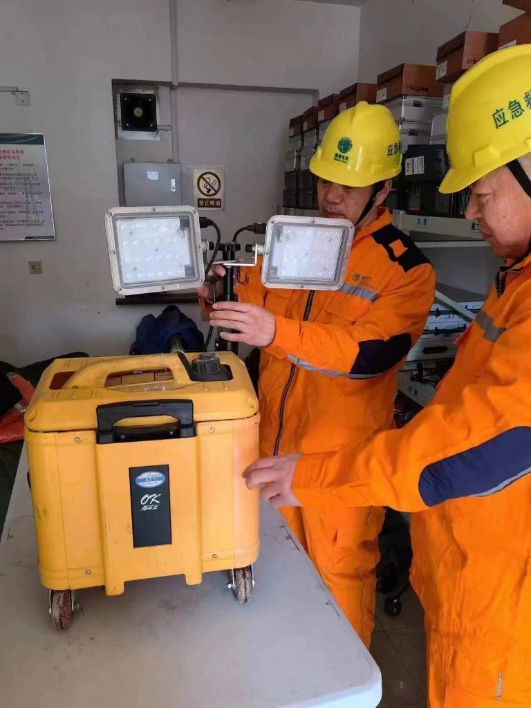 在鳳城市藍旗鎮(zhèn)廣勝村小學臨時安置點,藍旗鎮(zhèn)供電所工作人員正在調試應急照明設備。(國網(wǎng)丹東供電公司供圖)