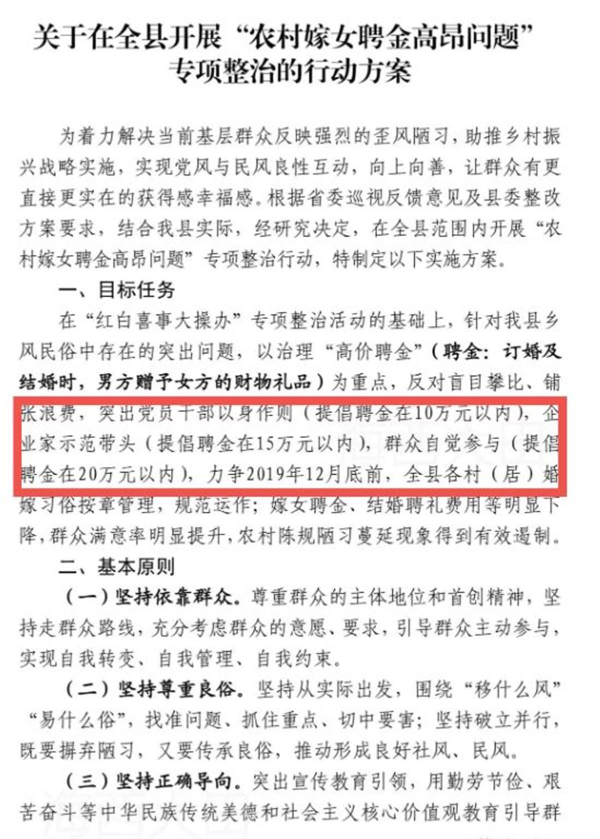 2019年5月,大田縣委辦公室就印發(fā)《關(guān)于在全縣開(kāi)展“農(nóng)村嫁女聘金高昂?jiǎn)栴}”專項(xiàng)整治的行動(dòng)方案》的通知。方案內(nèi)容有,針對(duì)該縣鄉(xiāng)風(fēng)民俗中存在的突出問(wèn)題,以治理“高價(jià)聘金”為重點(diǎn),反對(duì)盲目攀比、鋪張浪費(fèi),突出黨員干部以身作則(提倡聘金在10萬(wàn)元以內(nèi)),企業(yè)家示范帶頭(提倡聘金在15萬(wàn)元以內(nèi)),群眾自覺(jué)參與(提倡聘金在20萬(wàn)元以內(nèi)),力爭(zhēng)在2019年12月底前,結(jié)婚聘禮費(fèi)用等明顯下降。