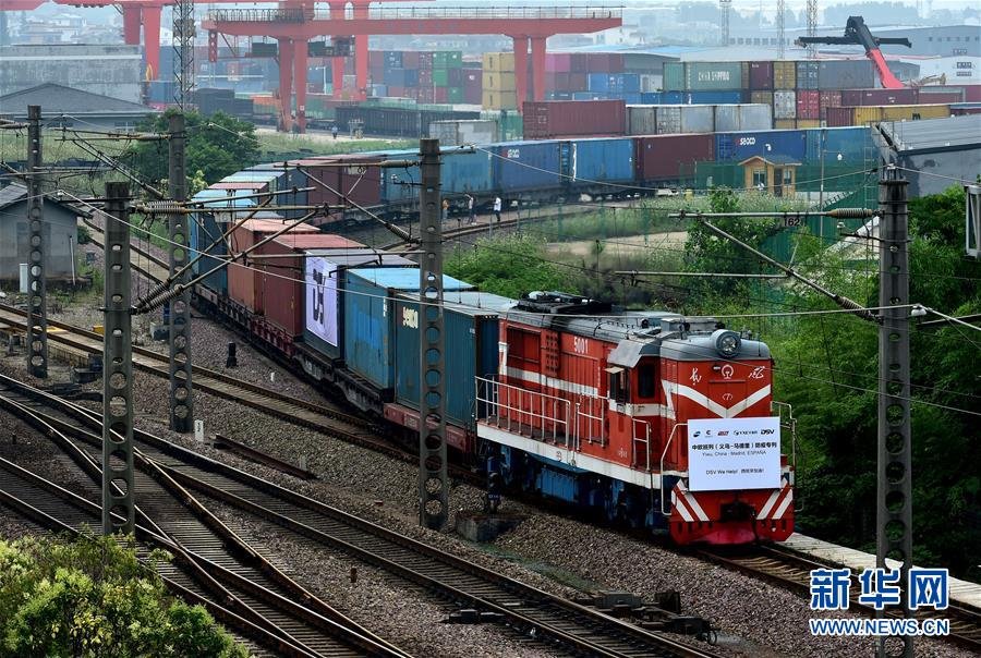 6月5日,滿(mǎn)載防疫物資的“義新歐”中歐班列(義烏-馬德里)在義烏西站啟程,前往西班牙首都馬德里。新華社發(fā)(呂斌攝)