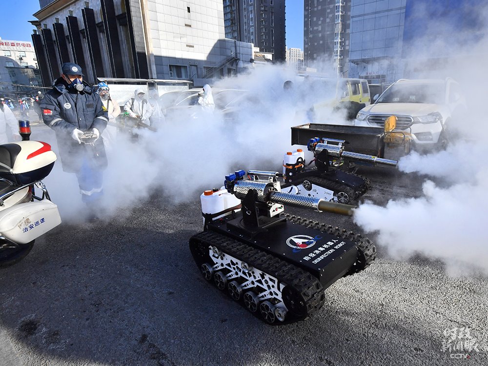 △1月9日,北京岳各莊市場,2臺“坦克”防疫消殺機器人對市場進(jìn)行消殺。這種消殺“新裝備”裝有大容量藥壺,每小時消殺約10000平方米。