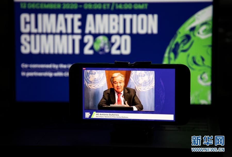 這是2020年12月12日在美國(guó)紐約拍攝的聯(lián)合國(guó)秘書(shū)長(zhǎng)古特雷斯在氣候雄心峰會(huì)上通過(guò)視頻發(fā)表講話的屏幕畫(huà)面。氣候雄心峰會(huì)由聯(lián)合國(guó)及有關(guān)國(guó)家倡議舉辦,旨在紀(jì)念《巴黎協(xié)定》達(dá)成五周年,進(jìn)一步動(dòng)員國(guó)際社會(huì)強(qiáng)化氣候行動(dòng),推進(jìn)多邊進(jìn)程。新華社記者