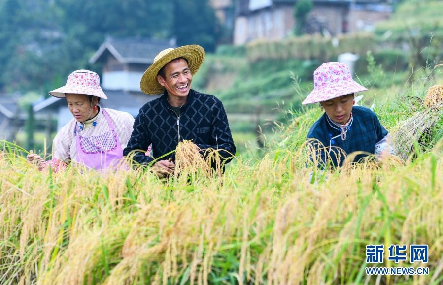 貴州省從江縣加榜鄉(xiāng)加車村的農民在收割水稻(2020年9月19日攝)。新華社記者 楊文斌 攝
