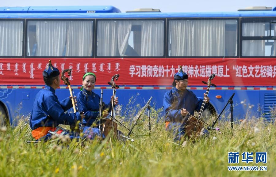 2018年9月13日,在內(nèi)蒙古自治區(qū)錫林郭勒盟鑲黃旗寶格達音高勒蘇木浩尼欽哈夏圖嘎查的一處草場,鑲黃旗烏蘭牧騎的隊員在為牧民表演文藝節(jié)目。新華社記者 彭源 攝