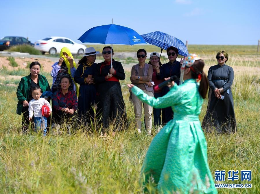 2018年9月13日,在內(nèi)蒙古自治區(qū)錫林郭勒盟鑲黃旗寶格達音高勒蘇木浩尼欽哈夏圖嘎查的一處草場,鑲黃旗烏蘭牧騎的隊員在為牧民表演文藝節(jié)目。新華社記者