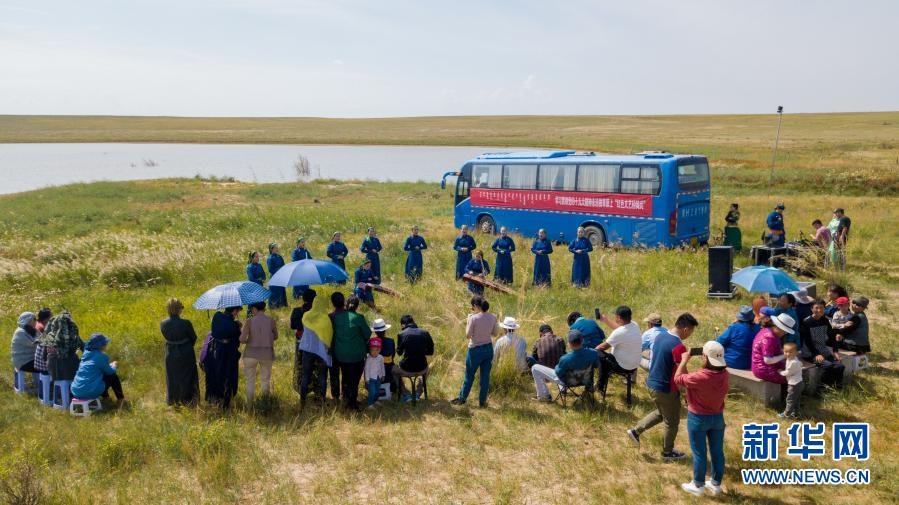 錫林郭勒盟烏蘭牧騎隊員在草原上為牧民演出(資料照片)。新華社發(fā)