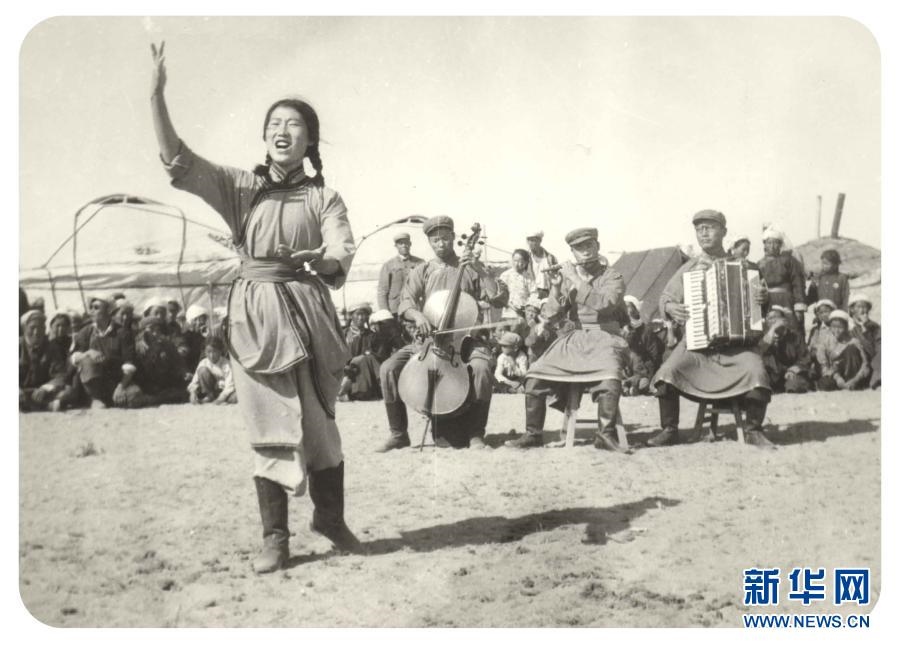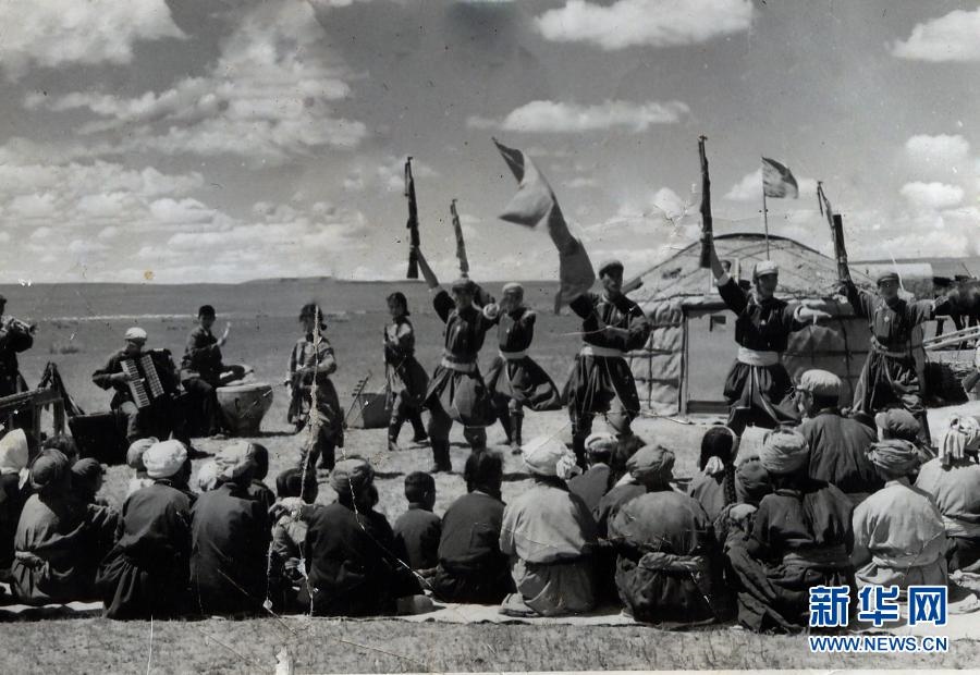 20世紀六七十年代,內(nèi)蒙古自治區(qū)錫林郭勒盟蘇尼特右旗烏蘭牧騎隊員在草原上為周邊牧民表演節(jié)目(資料照片)。新華社發(fā)