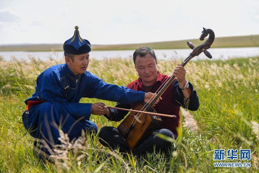 2018年9月13日,在內(nèi)蒙古自治區(qū)錫林郭勒盟鑲黃旗寶格達音高勒蘇木浩尼欽哈夏圖嘎查的一處草場,鑲黃旗烏蘭牧騎的隊員在為牧民演奏馬頭琴。新華社記者
