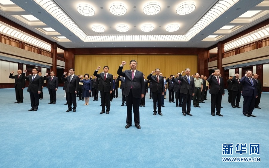 2021年6月18日,黨和國(guó)家領(lǐng)導(dǎo)人習(xí)近平、李克強(qiáng)、栗戰(zhàn)書、汪洋、王滬寧、趙樂際、韓正、王岐山等在中國(guó)共產(chǎn)黨歷史展覽館參觀“‘不忘初心、牢記使命’中國(guó)共產(chǎn)黨歷史展覽”。這是參觀結(jié)束后,習(xí)近平帶領(lǐng)黨員領(lǐng)導(dǎo)同志一起重溫入黨誓詞。新華社記者 李學(xué)仁 攝
