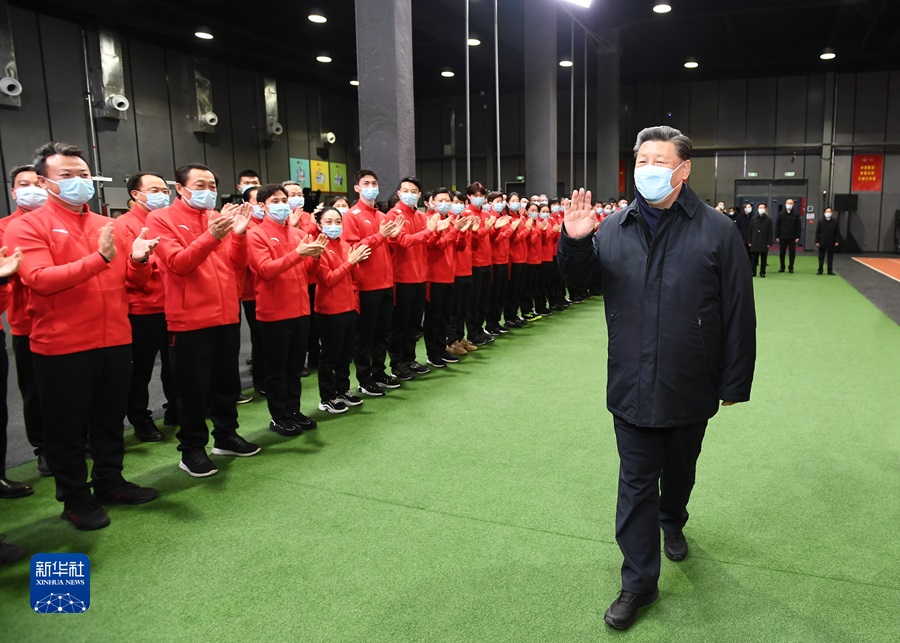 1月4日,中共中央總書(shū)記、國(guó)家主席、中央軍委主席習(xí)近平在北京考察2022年冬奧會(huì)、冬殘奧會(huì)籌辦備賽工作。這是4日下午,習(xí)近平在二七廠(chǎng)冰雪項(xiàng)目訓(xùn)練基地專(zhuān)項(xiàng)體能訓(xùn)練館,向運(yùn)動(dòng)員、教練員、服務(wù)保障人員揮手致意。新華社記者 謝環(huán)馳 攝