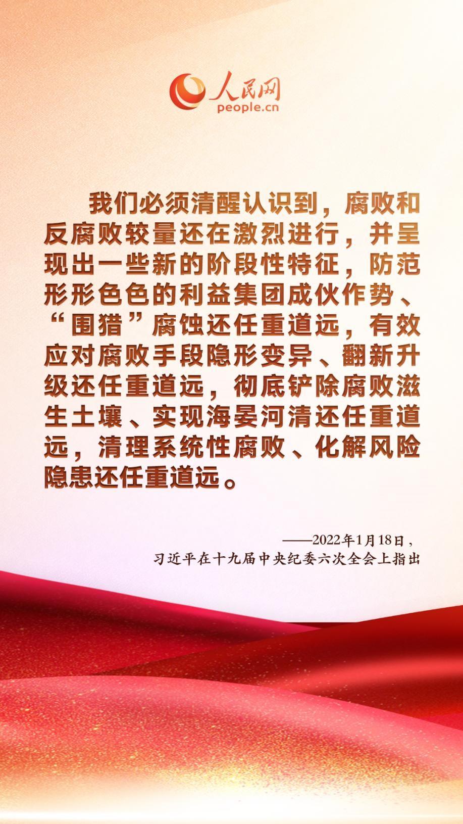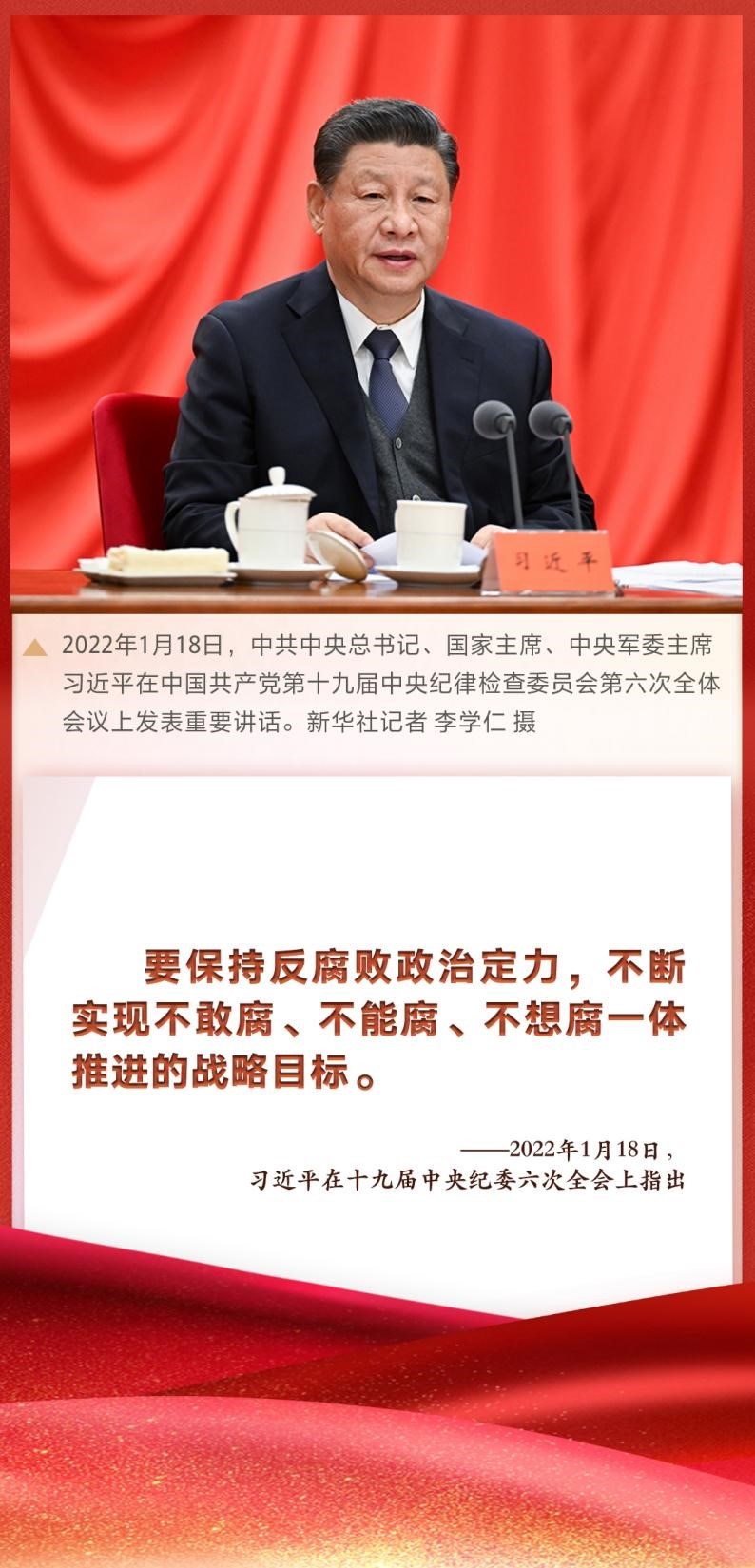 “要保持反腐敗政治定力,不斷實(shí)現(xiàn)不敢腐、不能腐、不想腐一體推進(jìn)的戰(zhàn)略目標(biāo)?!敝泄仓醒肟倳?、國家主席、中央軍委主席習(xí)近平在十九屆中央紀(jì)委六次全會(huì)上發(fā)表重要講話,深刻總結(jié)新時(shí)代黨的自我革命的成功實(shí)踐,深刻闡述全面從嚴(yán)治黨取得的歷史性、開創(chuàng)性成就,產(chǎn)生的全方位、深層次影響,對堅(jiān)持不懈把全面從嚴(yán)治黨向縱深推進(jìn)、迎接黨的二十大勝利召開作出戰(zhàn)略部署。