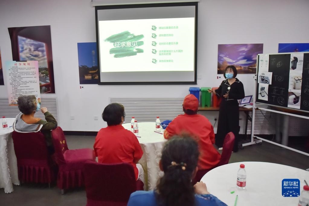 在北京建國(guó)門(mén)街道趙家樓社區(qū)議事廳舉行的“兩桶一袋”居民征求意見(jiàn)懇談會(huì)上,來(lái)自社區(qū)的12位垃圾分類(lèi)達(dá)人對(duì)“兩桶”款式進(jìn)行投票選擇,同時(shí),街道針對(duì)桶站位置、定時(shí)定點(diǎn)投放等垃圾分類(lèi)運(yùn)營(yíng)管理聽(tīng)取居民意見(jiàn)(2020年5月2日攝)。新華社記者彭子洋攝