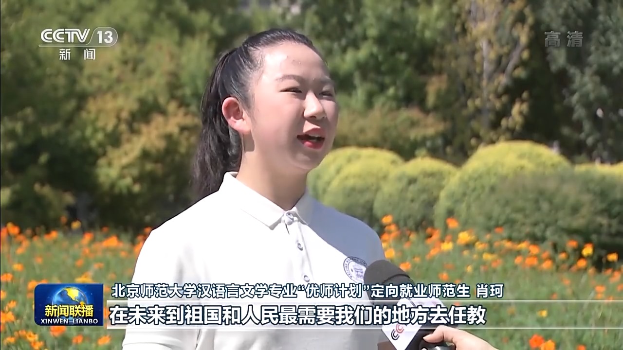 北京師范大學(xué)漢語言文學(xué)專業(yè)“優(yōu)師計(jì)劃”定向就業(yè)師范生肖珂:總書記勉勵(lì)我們增長傳道授業(yè)解惑本領(lǐng),在未來到祖國和人民最需要我們的地方去任教。我定不負(fù)囑托,努力學(xué)習(xí),在畢業(yè)后回到我的家鄉(xiāng)。