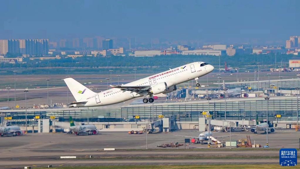 2022年5月14日6時(shí)52分,編號(hào)為B-001J的C919大飛機(jī)從上海浦東機(jī)場第4跑道起飛,于9時(shí)54分安全降落,標(biāo)志著中國商飛公司即將交付首家用戶的首架C919大飛機(jī)首次飛行試驗(yàn)圓滿完成。新華社發(fā)