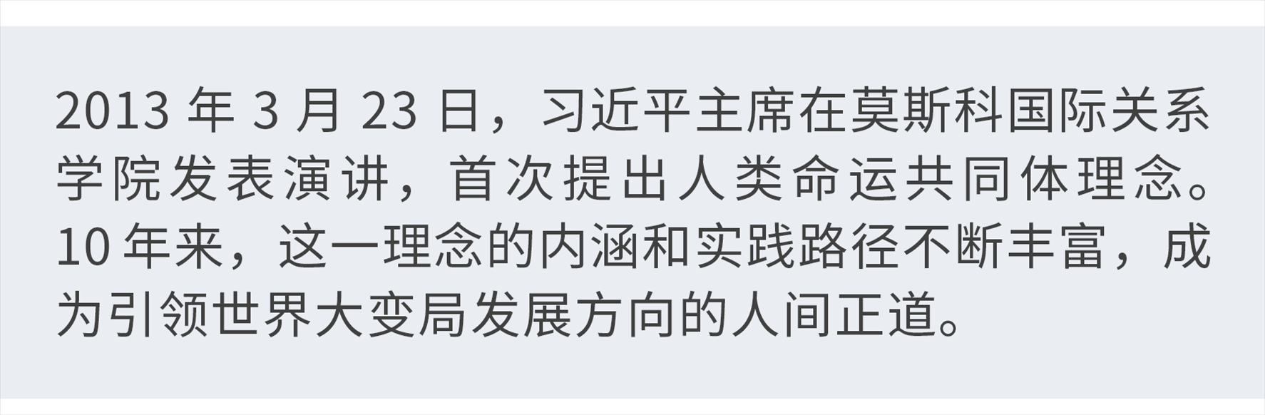 10年來,習(xí)近平主席以深邃的歷史眼光和博大的天下情懷,相繼提出共建“一帶一路”倡議、全球發(fā)展倡議、全球安全倡議、全球文明倡議,豐富了人類命運共同體理念的內(nèi)涵和實踐路徑,為應(yīng)對世界之變、時代之變、歷史之變提供了中國方案。
