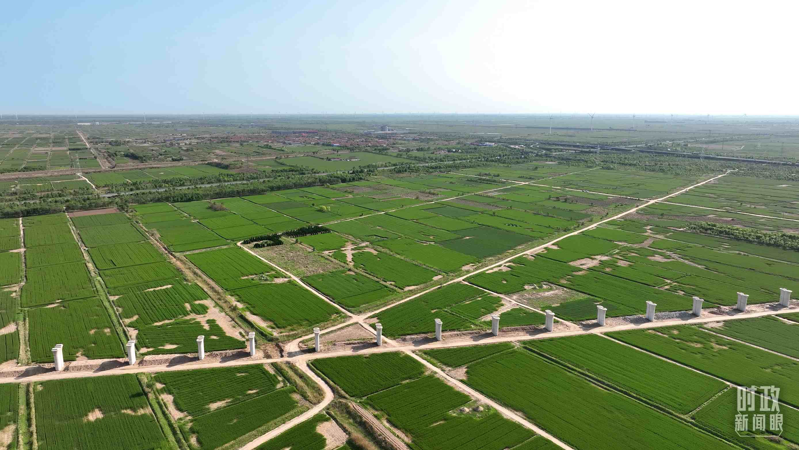 △旱堿麥田被分割成整齊劃一的綠色方塊。(總臺(tái)記者郭永良拍攝)