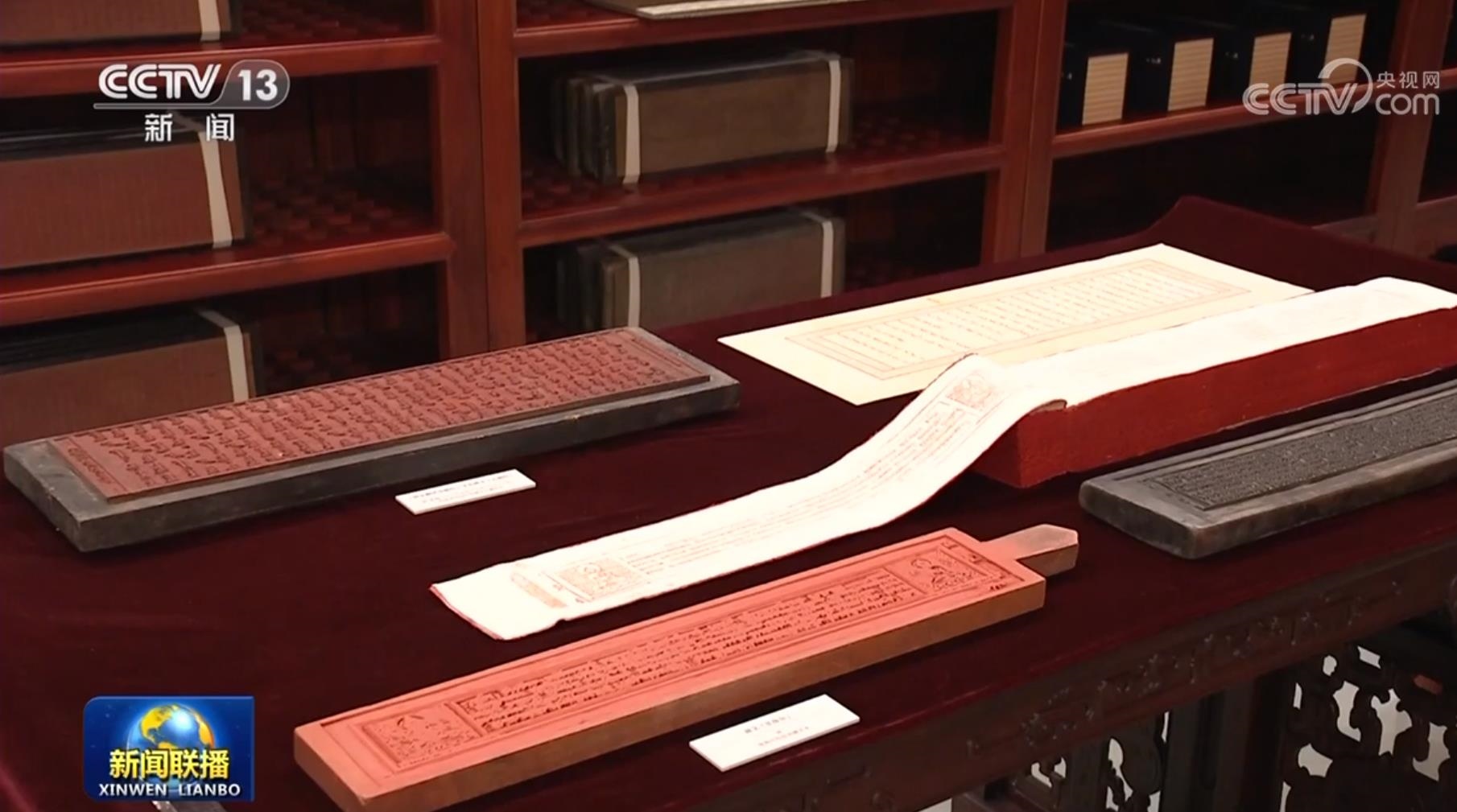 ▲圖為習(xí)近平總書記參觀的“漢藏蒙滿文大藏經(jīng)雕版合璧”庫(kù)展展品。