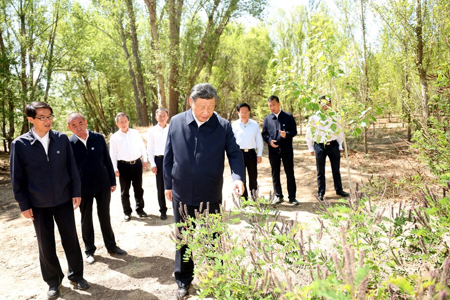 2023年6月5日至6日,中共中央總書記、國家主席、中央軍委主席習(xí)近平在內(nèi)蒙古巴彥淖爾考察,并主持召開加強荒漠化綜合防治和推進“三北”等重點生態(tài)工程建設(shè)座談會。這是6日上午,習(xí)近平在臨河區(qū)國營新華林場考察。新華社記者