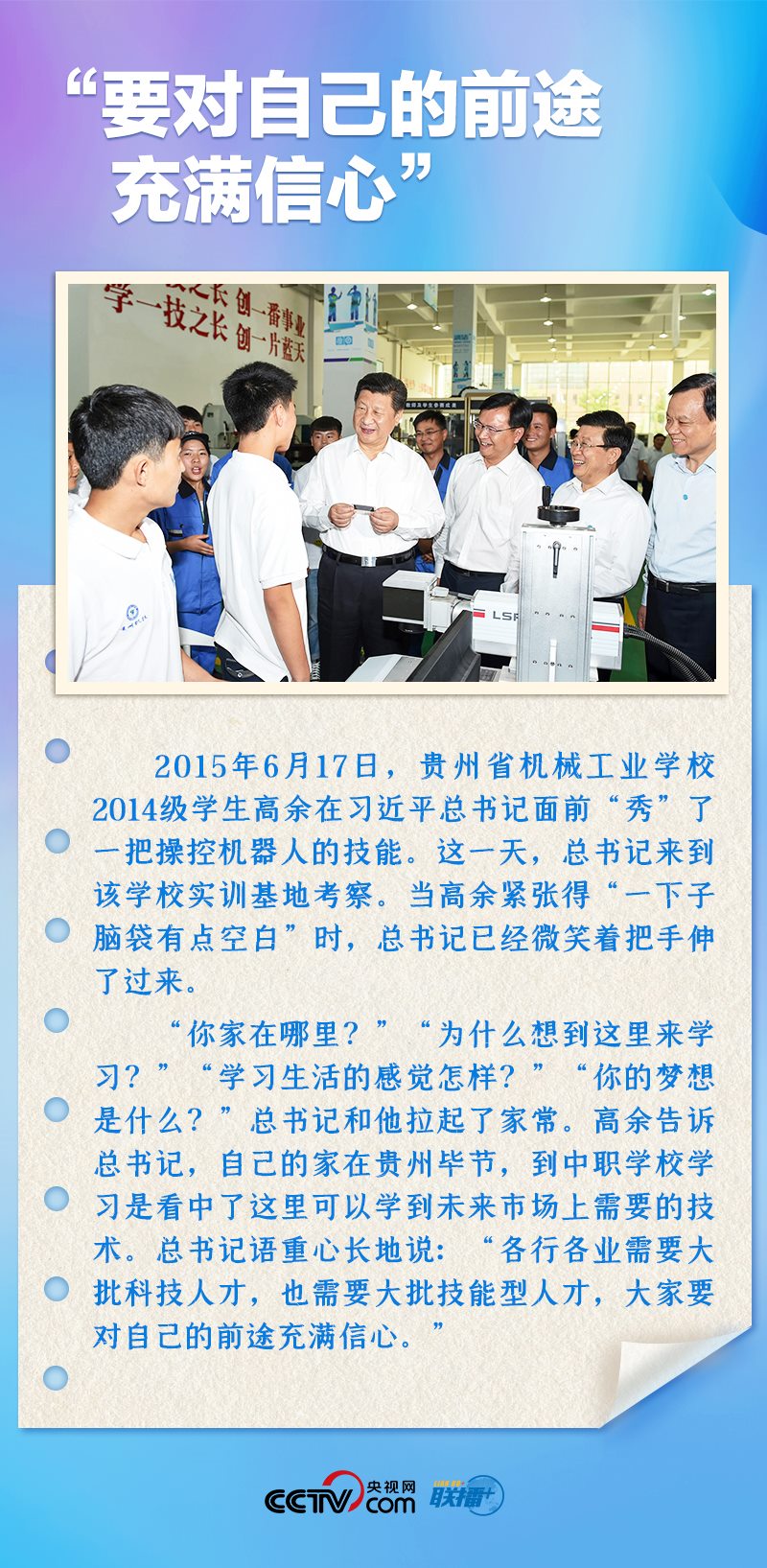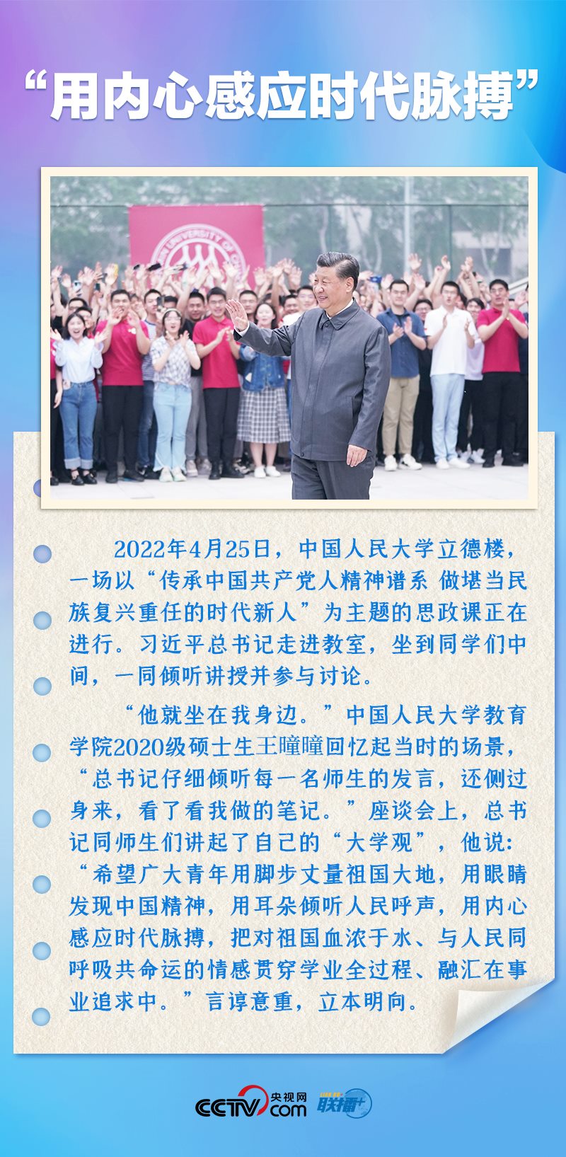 習(xí)近平總書記非常關(guān)心青年成長(zhǎng),多次來(lái)到青年中間,同大家推心置腹談理想信念、談人生價(jià)值、談奮斗奉獻(xiàn)。