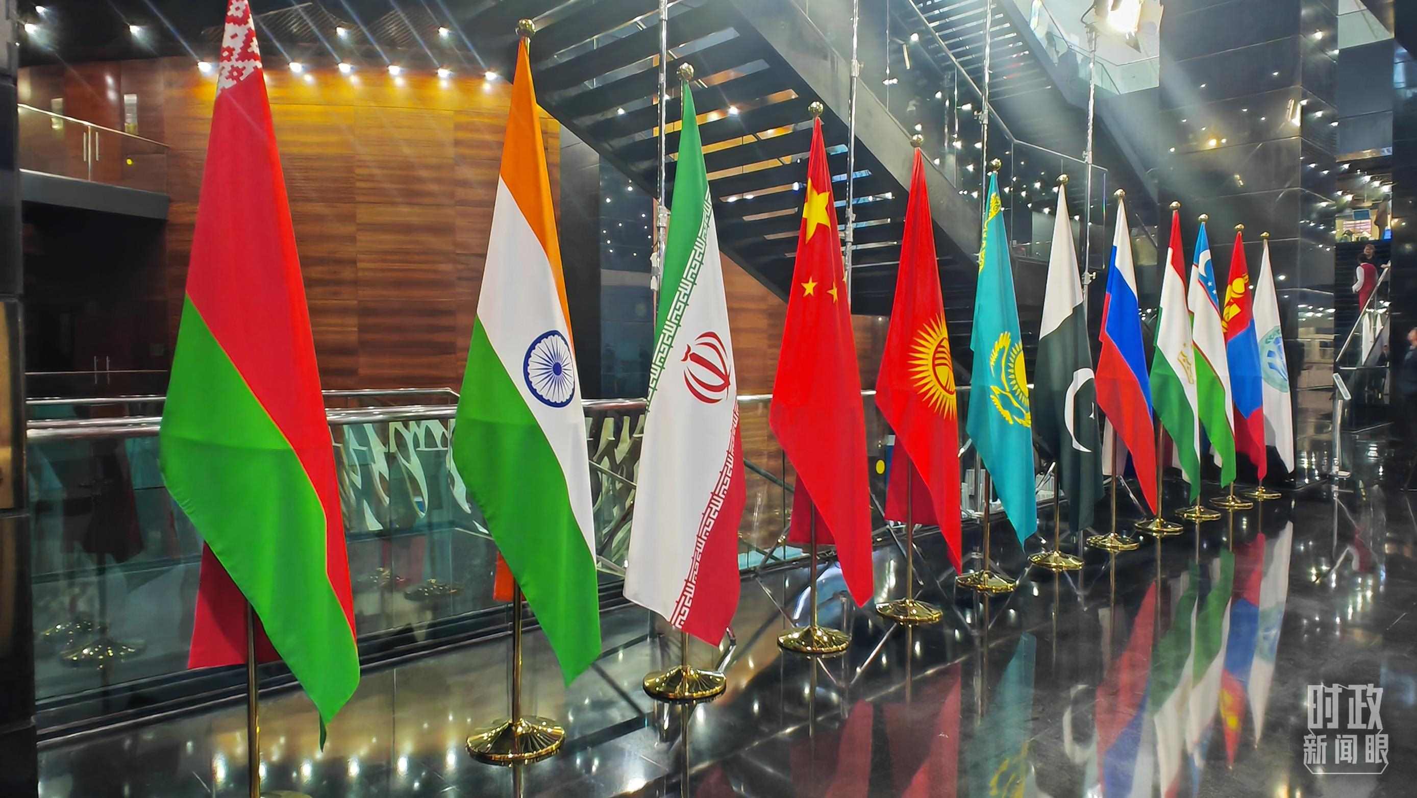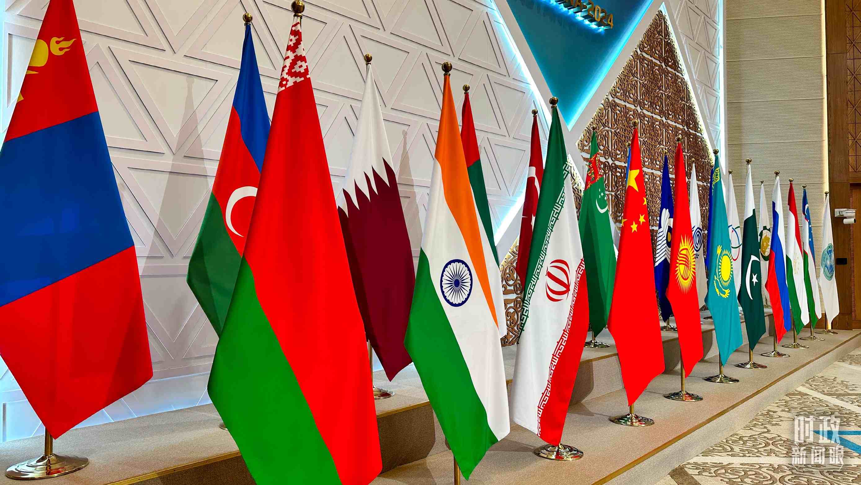 △阿斯塔納峰會(huì)現(xiàn)場擺放的旗幟。(總臺(tái)央視記者關(guān)舟拍攝)