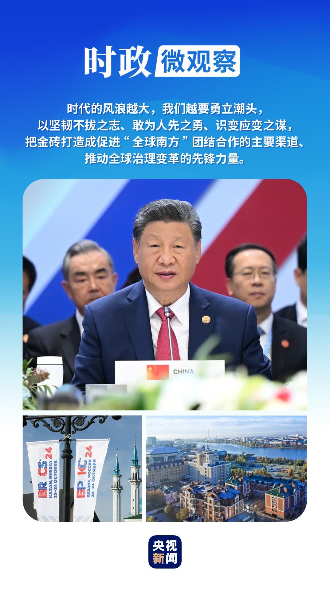 當(dāng)?shù)貢r間2024年10月23日,習(xí)近平主席出席金磚國家領(lǐng)導(dǎo)人第十六次會晤并發(fā)表重要講話。面對是任由世界動蕩不安,還是推動其重回和平發(fā)展正道的關(guān)鍵抉擇,習(xí)近平主席給出中國答案:“時代的風(fēng)浪越大,我們越要勇立潮頭,以堅韌不拔之志、敢為人先之勇、識變應(yīng)變之謀,把金磚打造成促進(jìn)‘全球南方’團(tuán)結(jié)合作的主要渠道、推動全球治理變革的先鋒力量?!?/p>