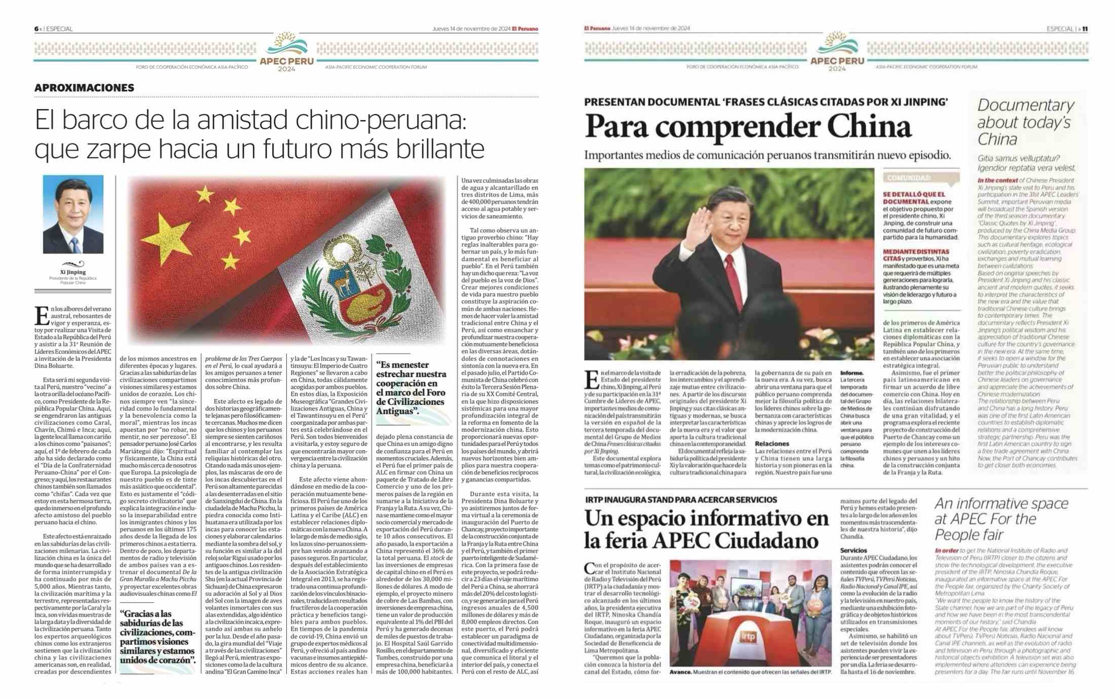 在中國國家主席習(xí)近平應(yīng)秘魯共和國總統(tǒng)博魯阿爾特邀請,赴利馬出席亞太經(jīng)合組織第三十一次領(lǐng)導(dǎo)人非正式會議并對秘魯進(jìn)行國事訪問之際,由中國中央廣播電視總臺制作的《平“語”近人——習(xí)近平喜歡的典故》第三季(西班牙語版),將于當(dāng)?shù)貢r(shí)間11月14日起在秘魯國家廣播電視臺、秘魯電視聯(lián)播網(wǎng)、秘魯廣播節(jié)目集團(tuán)電視端等多平臺落地播出。當(dāng)?shù)囟嗉抑髁髅襟w對節(jié)目落播進(jìn)行預(yù)告,引發(fā)秘魯各界普遍期待和廣泛關(guān)注。
