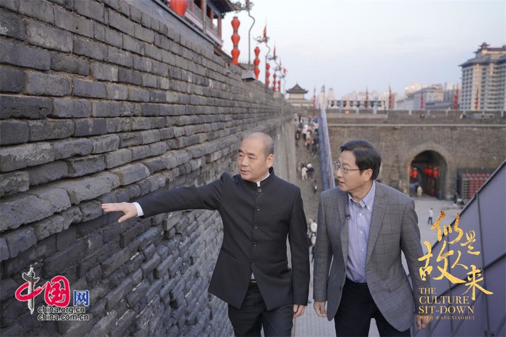 王曉輝(右一)與侯寧彬在西安城墻 中國網(wǎng) 記者 胡俊 攝