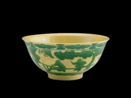 清同治·景德鎮(zhèn)窯黃地綠釉嬰戲圖碗。色地彩瓷是以各種不同的顏色釉為地,再施一種彩為飾,各種色彩互相交錯(cuò)使用,形成“一地一彩”的瓷器,如黃地綠彩、綠地紫彩、綠地黃彩、紅地黃彩、紫地綠彩等多種色地彩瓷。屬低溫彩釉,最早在明代永樂(lè)時(shí)期出現(xiàn)。(圖片來(lái)源:上海博物館)