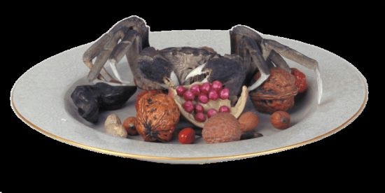 清乾隆·粉彩像生瓷果品盤(pán)。盤(pán)中諸果品不但酷似實(shí)物,而且都具有吉祥含義,如螃蟹寓意“一甲”,即科舉殿試第一;荔枝樹(shù)有“經(jīng)四百余年猶能結(jié)實(shí)者”之說(shuō),象征長(zhǎng)壽;核桃、石榴是多子多福的象征;而棗、花生、瓜子等則寓意“早生貴子”。(圖片來(lái)源:故宮博物院)