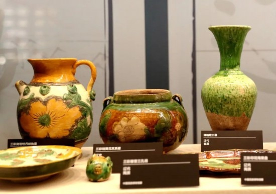 “遼三彩”直接承襲和模仿“唐三彩”,成為中華陶瓷文化傳承發(fā)展史上的重要一環(huán)。后排文物從左到右依次是:三彩刻劃牡丹紋執(zhí)壺、三彩劃葵花雙系罐、綠釉敞口瓶。(民族畫報記者 鷹鴿 攝)
