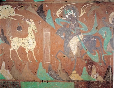 莫高窟第257窟西壁《九色鹿本生故事之九色鹿》局部。以上圖片均為敦煌研究院提供