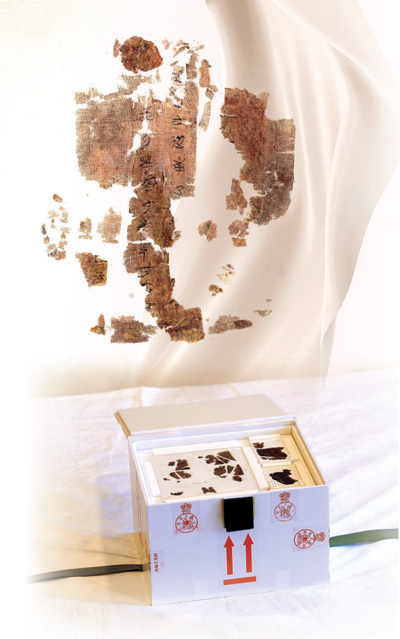 工作人員小心翼翼地打開文物包裝箱,《五行令》《攻守占》露出真容,深褐色的殘片被保存在有機(jī)玻璃里。盡管歷經(jīng)2000余年,但帛書上的殘留文字依稀可辨。