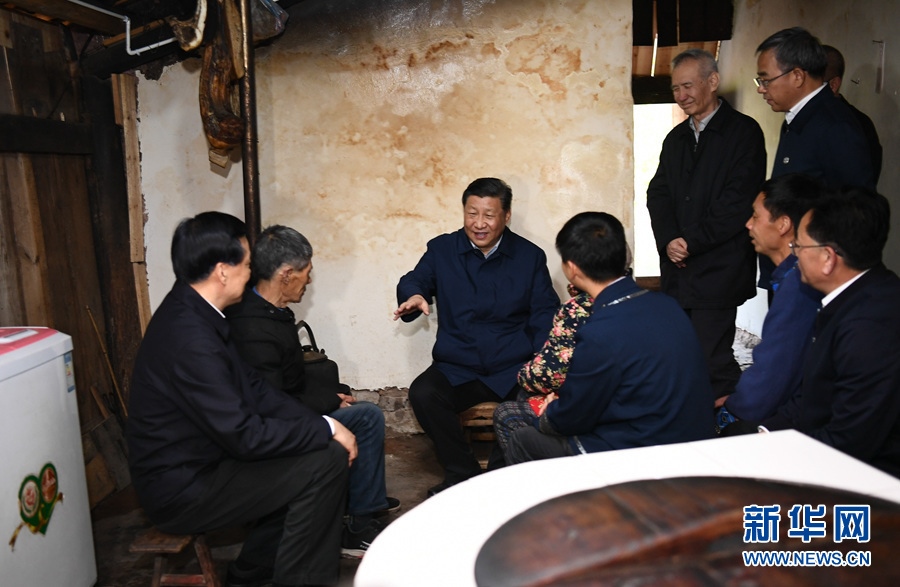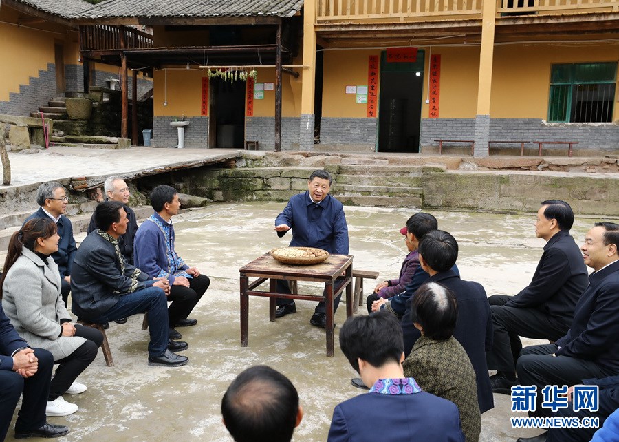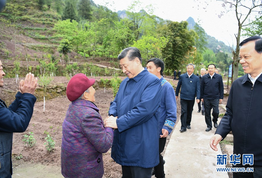 這是4月15日下午,習(xí)近平在石柱土家族自治縣中益鄉(xiāng)華溪村看望貧困戶譚登周一家。 新華社記者 謝環(huán)馳 攝