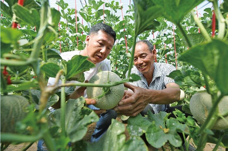 2020年7月,呼和浩特市賽罕區(qū)黃合少鎮(zhèn)賽音不浪村建立網(wǎng)紋瓜種植基地,科技特 派員 李國 慶(左)向種植戶提供技術、種子,采取訂單銷售,帶領村民致富。