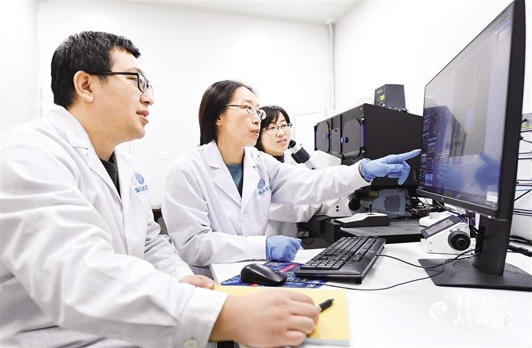 內(nèi)蒙古大學(xué)生命科學(xué)學(xué)院院長、省部共建草原家畜生殖調(diào)控與繁育國家重點實驗室主任胡薇(中)與團隊成員觀察動物的成纖維細胞結(jié)構(gòu)形態(tài)。內(nèi)蒙古日報社融媒體記者