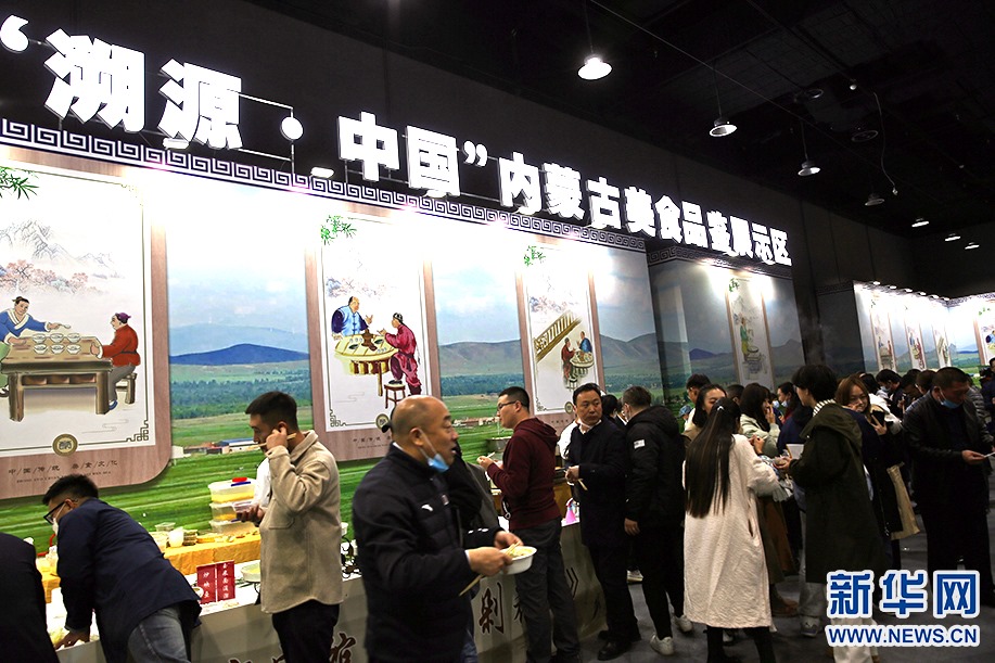 “溯源中國(guó)”內(nèi)蒙古美食品鑒展示區(qū)里,觀(guān)眾品鑒內(nèi)蒙古美食。新華網(wǎng) 石毅 攝