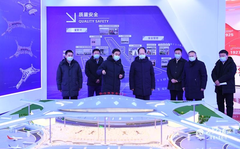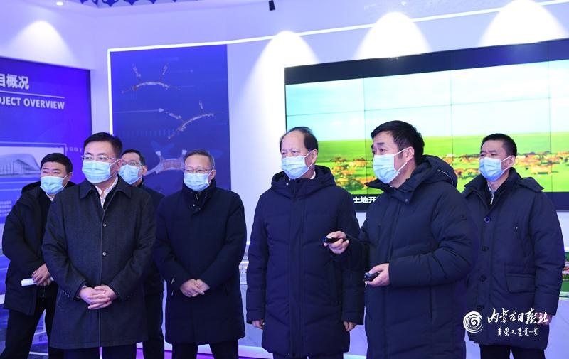 1月18日下午,自治區(qū)黨委書記、人大常委會主任石泰峰在呼和浩特新機場智慧展廳,聽取新機場主體建設情況介紹。內(nèi)蒙古日報社融媒體記者 袁永紅 攝