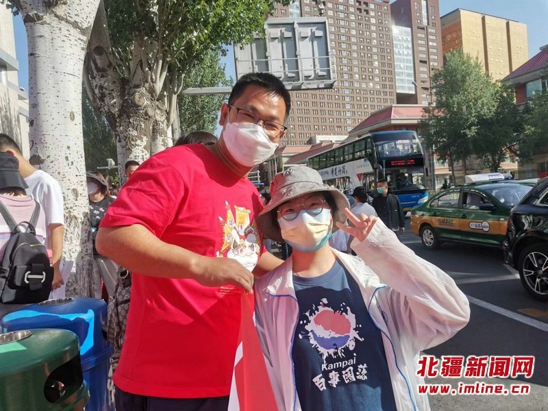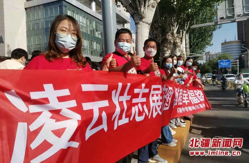 呼和浩特市實(shí)驗(yàn)中學(xué)察哈爾校區(qū)的送考教師身穿旗開得勝的紅色T恤,戴印有“金榜題名”的紅色口罩為學(xué)生加油助威,并祝愿所有考生“凌云壯志展宏圖 錦繡前程幸福路”。