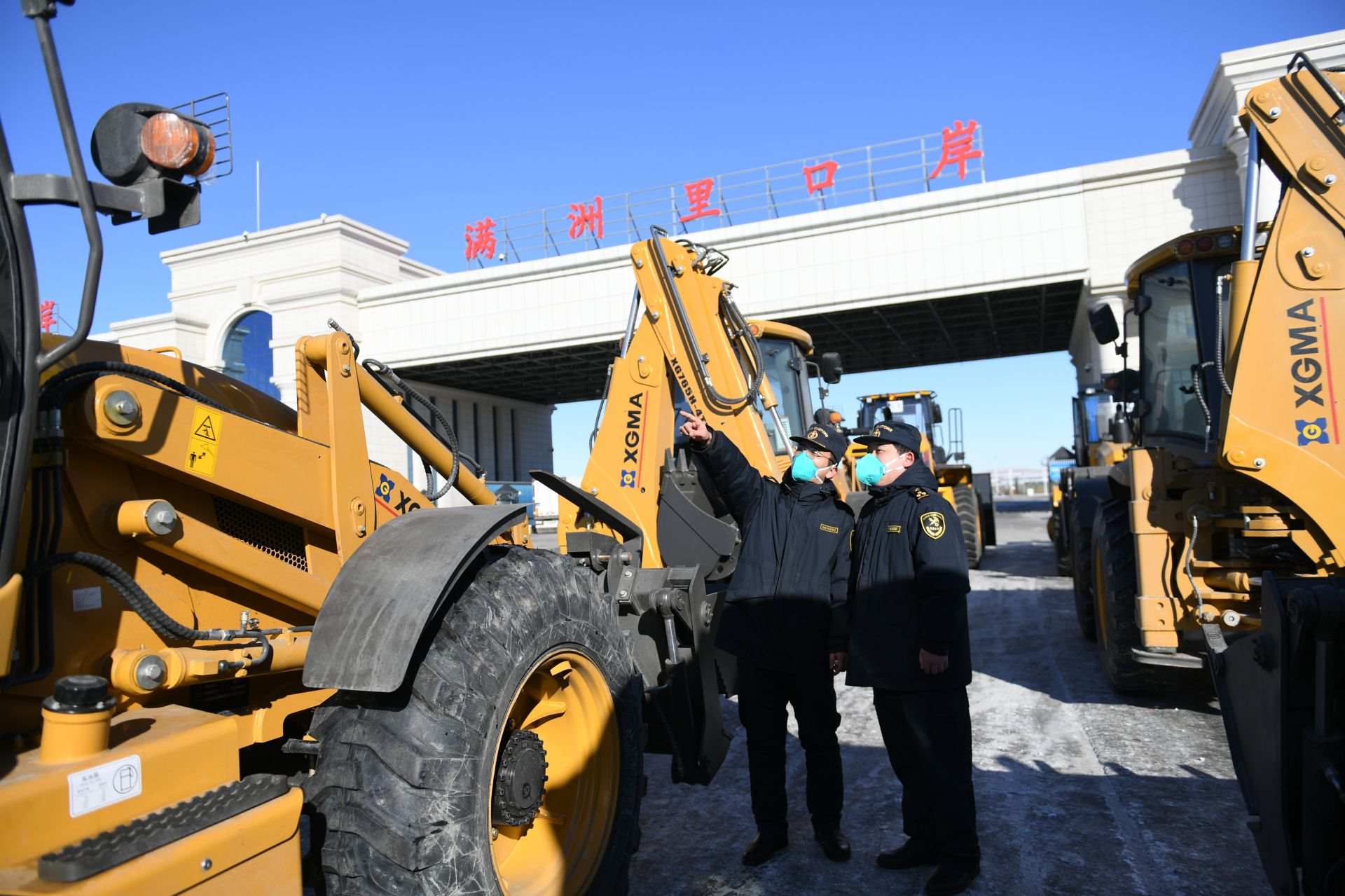 海關(guān)工作人員正在對(duì)出口工程機(jī)械車輛進(jìn)行登臨檢查。