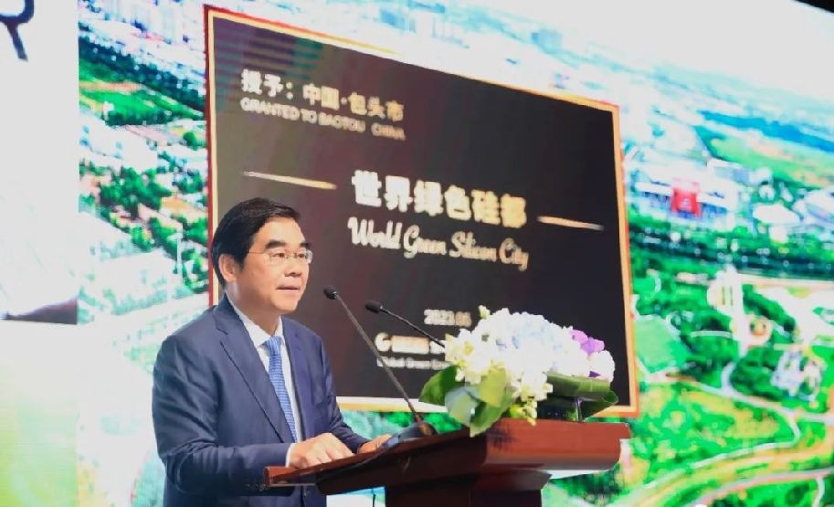 5月23日,第十六屆(2023)國際太陽能光伏與智慧能源(上海)大會召開。大會開幕式上,全球綠色能源理事會授予包頭市“世界綠色硅都”稱號。澳大利亞新南威爾士大學(xué)教授、超高效光電學(xué)研究中心兼任執(zhí)行研究主任、澳大利亞科學(xué)院院士馬丁·格林代表全球綠色能源理事會向包頭市授牌。自治區(qū)黨委常委、市委書記丁繡峰致辭并推介“世界綠色硅都”。市委副書記、市長張銳代表包頭市接牌。
