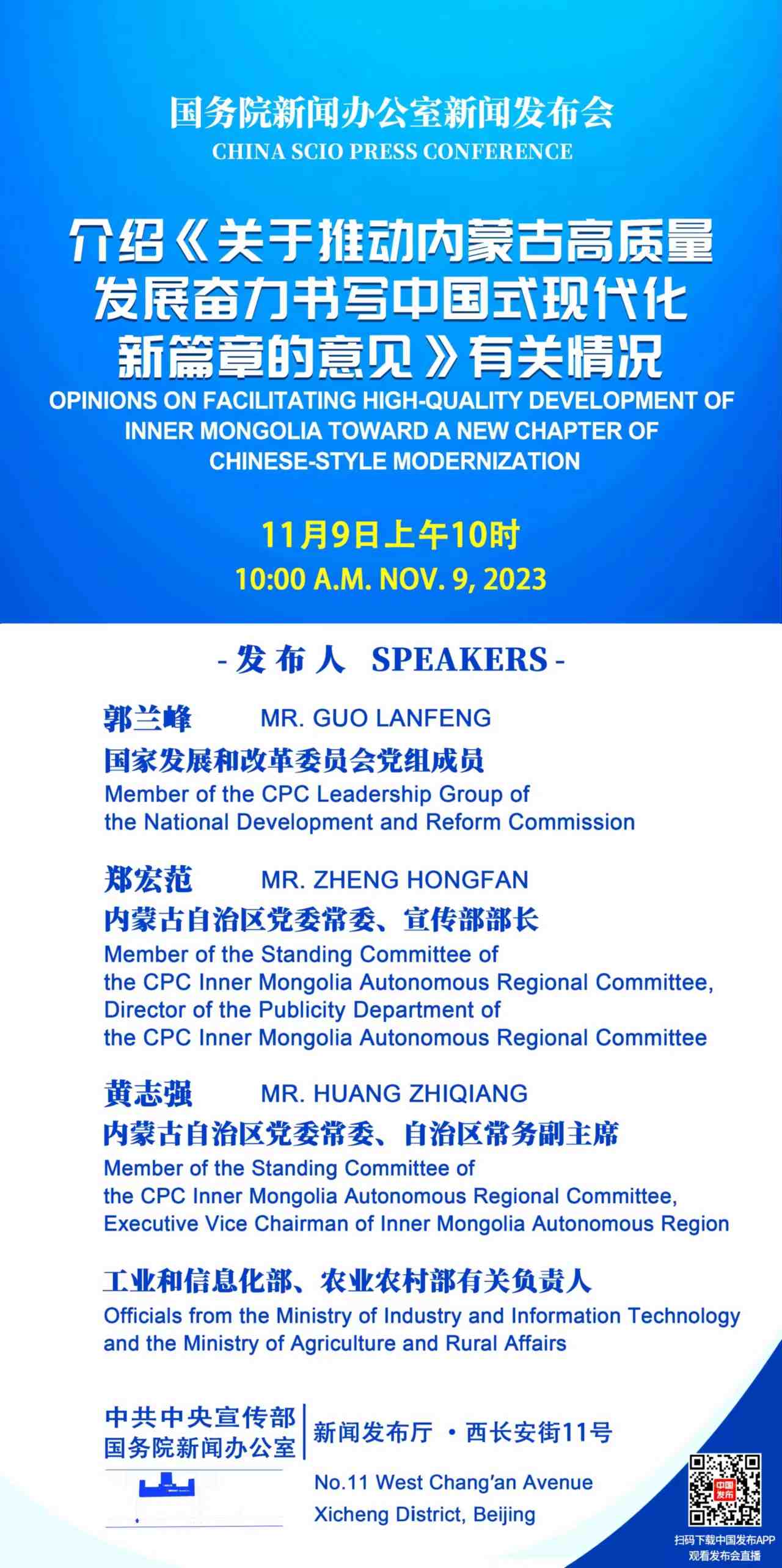 2023年11月9日(星期四)上午10時(shí),國(guó)務(wù)院新聞辦公室舉行新聞發(fā)布會(huì),請(qǐng)國(guó)家發(fā)展和改革委員會(huì)黨組成員郭蘭峰,內(nèi)蒙古自治區(qū)黨委常委、宣傳部部長(zhǎng)鄭宏范,內(nèi)蒙古自治區(qū)黨委常委、自治區(qū)常務(wù)副主席黃志強(qiáng)和工業(yè)和信息化部、農(nóng)業(yè)農(nóng)村部有關(guān)負(fù)責(zé)人介紹《關(guān)于推動(dòng)內(nèi)蒙古高質(zhì)量發(fā)展奮力書(shū)寫(xiě)中國(guó)式現(xiàn)代化新篇章的意見(jiàn)》有關(guān)情況,并答記者問(wèn)。