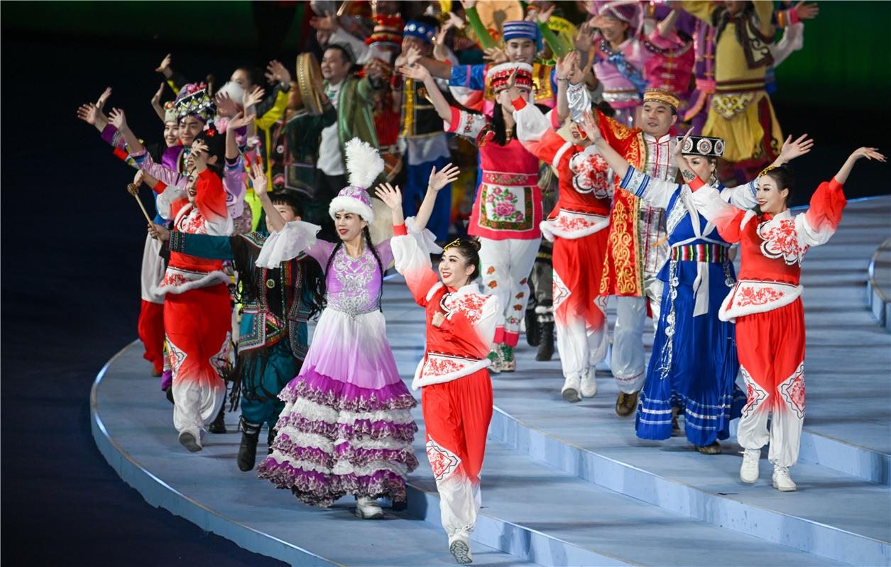其中文體展演包括序篇《共同的家園》、主篇章《山河共錦繡》《冰雪共相約》《攜手共奮進(jìn)》和尾聲《共同的未來(lái)》,展演將中國(guó)風(fēng)范、民族特色、北疆韻味、運(yùn)動(dòng)活力通過(guò)科技手段創(chuàng)意呈現(xiàn),在傳承與創(chuàng)新的碰撞下,展現(xiàn)了草原文化、冰雪文化和民族文化的多彩魅力。