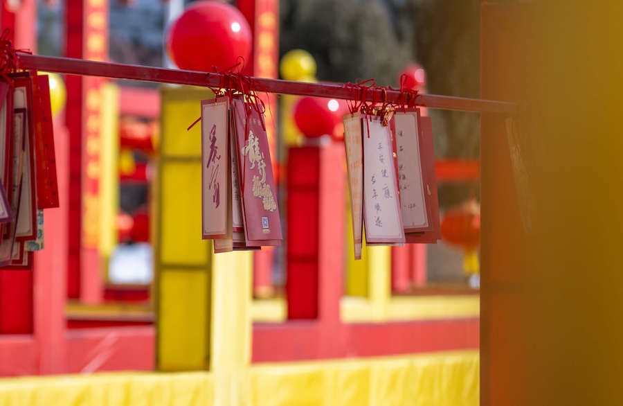 在九曲中,有九道門,其中八道門可以猜燈謎,猜對(duì)后換一張祈福卡來(lái)到吉祥門進(jìn)行許愿祈福。