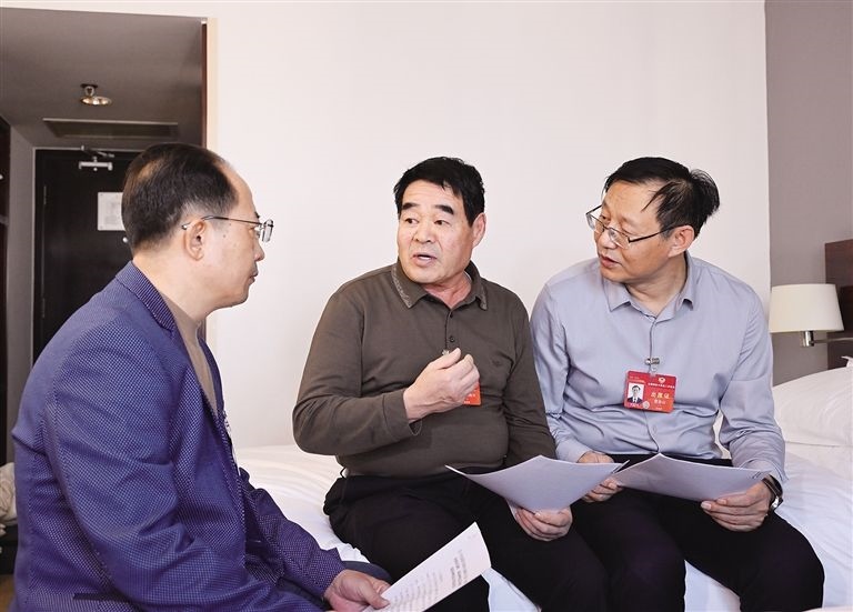 3月4日,住我區(qū)全國政協(xié)委員阿拉騰達(dá)來(左)、廷·巴特爾(中)、曹金山(右)在住地,就進(jìn)一步提高草原生態(tài)保護(hù)補(bǔ)助獎勵標(biāo)準(zhǔn),為打贏“三北”工程攻堅戰(zhàn)和三大標(biāo)志性戰(zhàn)役奠定政策基礎(chǔ)的提案進(jìn)行討論。草原全媒·內(nèi)蒙古新聞網(wǎng)記者 韓卿立 攝